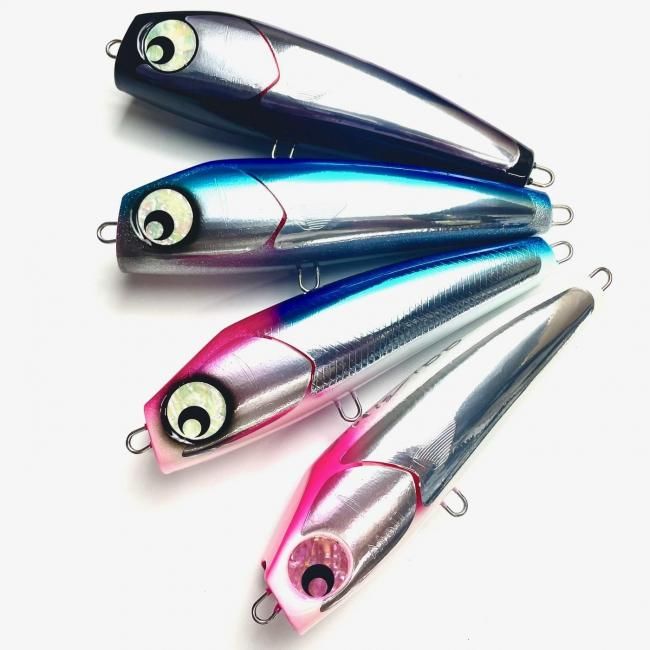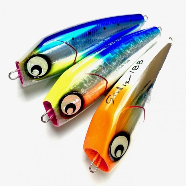 コンパクトボディーとフックの組み合わせで 泡をまといながら不規則に動くのが武器です。 カップの上側がカットされているのでジャークするとその形状からくる水押でジュリアは 不規則に動き狙っているターゲットにアピールするので誘い出しにも有効です。 ジャークしてからの食わせの間を与えてみてください。 飛距離はコンパクトボディーでウエイトがあるのでストレスなくよく飛びます。 コンパクトボディなのでベイトが小さく、飛距離がいるときにも使いやすいジュリアです。 ウエイト:約145g (天然素材を使っていますのでウエイトに誤差が生じます) サイズ: 約188mm 1.8mmワイヤー貫通 推奨フックウエイト: 約13g 推奨ライン: PE 12〜14号 フック込みウエイト: 約170g
