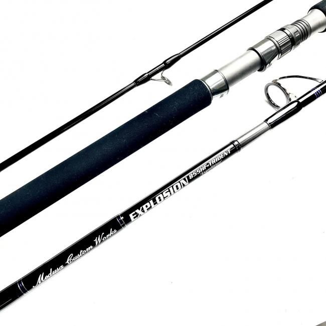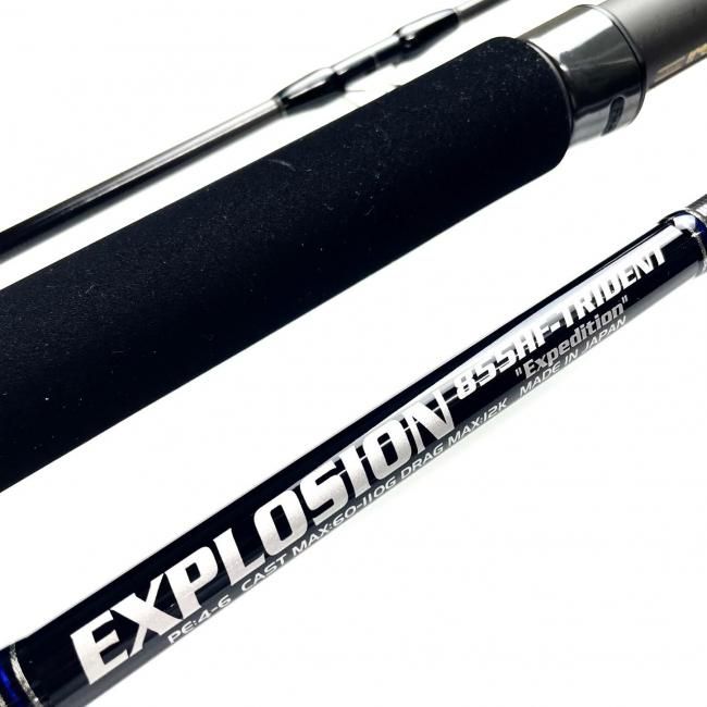 EXPLOSION 855HF-TRIDENT STANDARD MODEL ¥67.100-(税込) LENGTH 8’5” LINE PE #4-6 CAST RANGE 60-110G DRAG MAX 12KG 使い易い5パワーEXPLOSIONの3ピースTRIDENT。コンパクトなパッキングのロングレンジモデル。ヒラマサだけでなくマグロのポッピングワーク等にも最適です。 ※チタンハイブリッドPMNSG+KWSGガイド ※仕舞寸法995MM ロッド袋、免責保証書付属