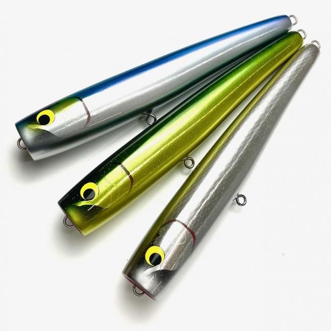 270にサイズアップして#7/0フック搭載可能仕様が登場。 BIG TUNAをターゲットに更なる形状と泳ぎを調整しました。GTなどの魚種にも対応可能。 HAND MADE IN JAPANにこだわった逸品です。 270mm 約170g 推奨フック:ST-68 #5/0又は#7/0 推奨リング:#10クラス 素材:ハードウッド(木製品につき重量のバラツキが有ります。)