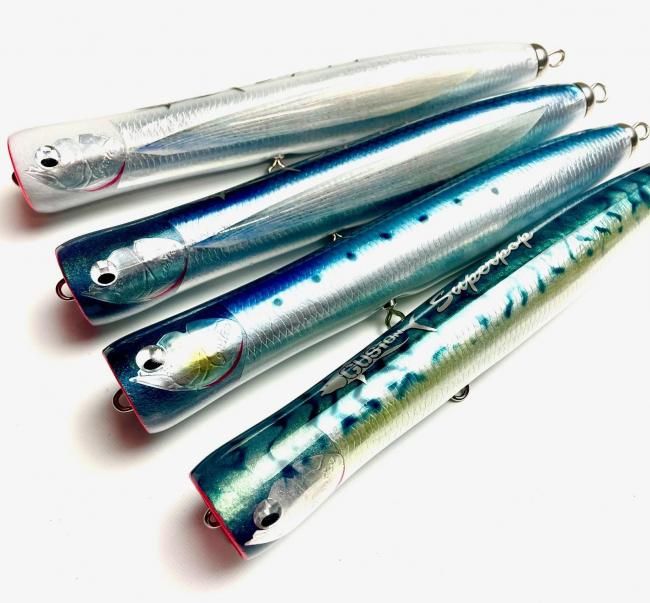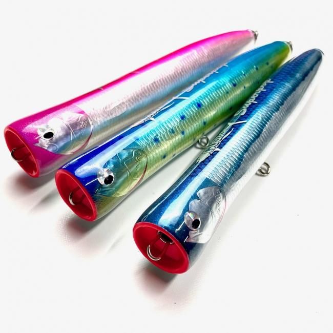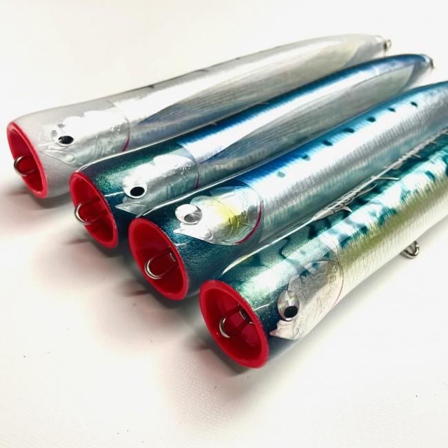 圧倒的な飛距離と深いカップからの大きめの泡とポップ音でマグロを誘います。 特に10号〜タックルでの大型マグロに。 強度も抜群です。 フックは4/0 5/0 シングルフック9g前後 ゆっくり目のポッピングが良い泡を出すコツです。 北海道、青森のモンスター鮪に!