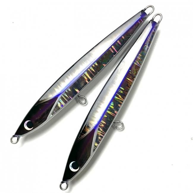飛距離重視のヘビーウェイトながら水平沈下姿勢を保つギリギリのバランスセッティング マグロのナブラはもちろんヒラマサキャスティングでトップに出にくい状況でカウントダウン後、ミディアムからハイスピードのリーリングによる誘い上げはヒラマサキャストのシークレットメソッド。 春のベイトの小さいヒラマサに オリカラはカタクチにも見えるしキビナゴ、秋刀魚にも見えるカラーにしました。
